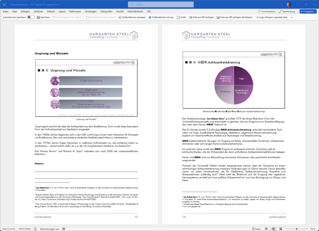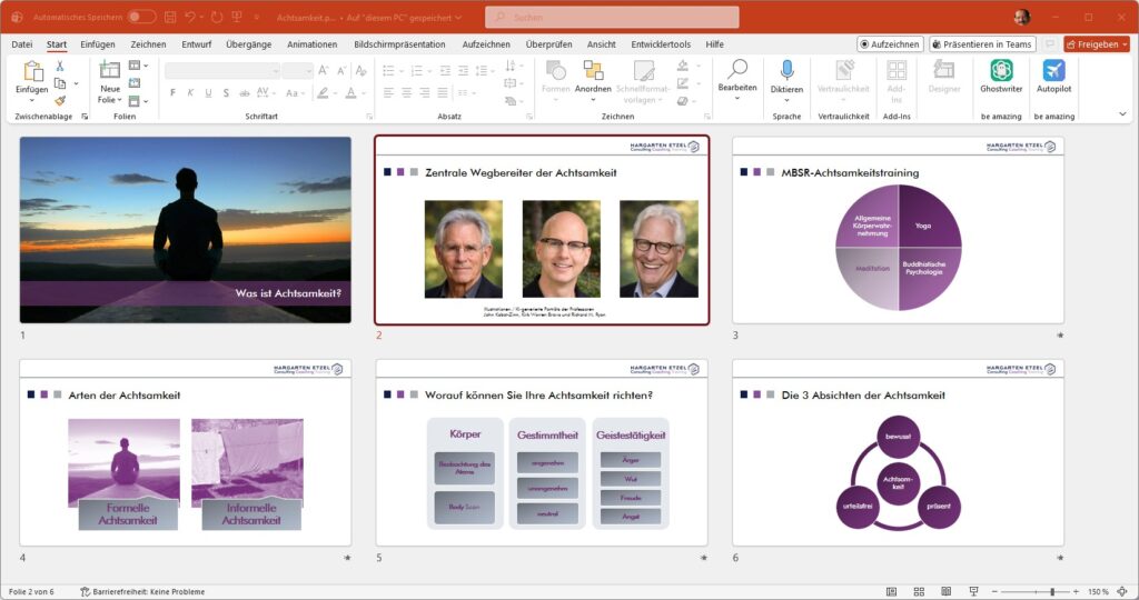 Denn Achtsamkeit ist die Fähigkeit bewusst und ohne Wertung den gegenwärtigen Augenblick wahrzunehmen. So schaffen Sie einen bewussten Abstand zu gewohnten und unbedachten Emotions-, Gedanken- und Reaktionsmustern, reduzieren Stress und Druck und eröffnen Freiräume für alternative und optimierte Handlungsoptionen.
